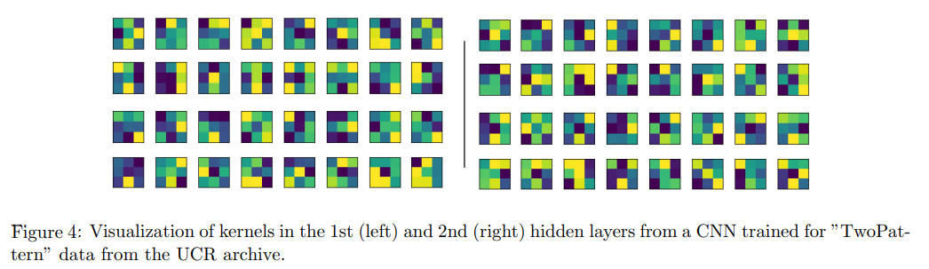 그림 4에서 두 합성곱 블럭의 학습된 필터들을 시각화하여 제시하고 있으며 3 x 3 필터를 사용함으로 최대 길이 5의 패턴을 활성가능합니다. 이 시각화를 통해서 실제로 RP에서 어떤 패턴을 찾는 필터인지 연결가능하며 1차원 신호를 학습할때에 비해 설명가능한 장점이 있습니다.